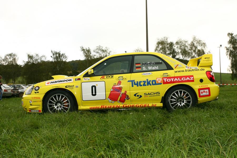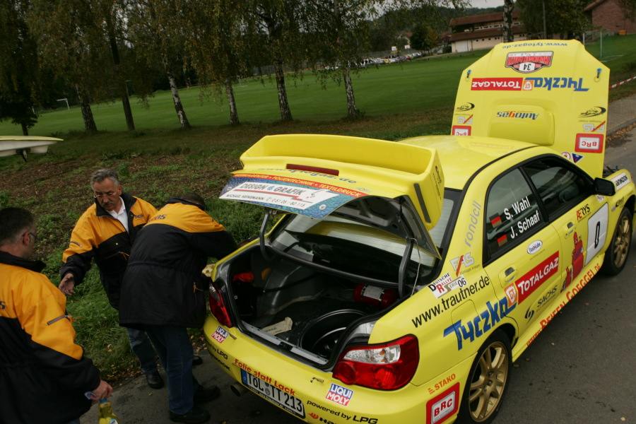 Der Motor: Ein 2,0 Liter Boxermotor mit Turbo und serienmäßig 265 PS. Durch verschiedene Tuningmaßnahmen verfügt unser Fahrzeug überca. 300 PS. Entsprechend der vom DMSB vorgeschriebenen Regelungen müssen Turbofahrzeuge im Rallyesport mit einem Air-Restriktor ausgestattet sein.Das heißt, mit einer künstlichen Verengung im Ansaugtrakt drücken wir ihm den Hals zu und damit bekommt er zwangsläufig weniger Luft zum Atmen. Das kostet entsprechend Leistung, so dass wir derzeit ungefähr 245 PSauf die Strasse bringen. Damit sehen wir im Vergleich zu normalen Gruppe N Fahrzeugen natürlich etwas schlechter aus, aber wir arbeiten daran.
